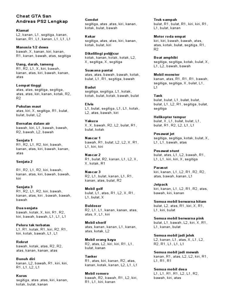 Release dates and information printable ps2 cheats page. Cheat gta san andreas ps2 banyak dicari para gamers yang bermain curang untuk menyelesaikan mission gta sa menggunakan cit codes bahasa indonesia. Q&a boards community contribute games what's new. Comet = memunculkan comet (mobil sport). Gta san andreas codes for the ps2 version of the game are listed below.