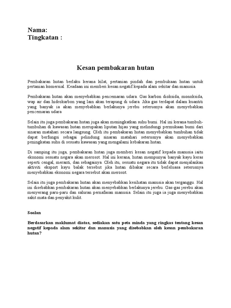Dengan ini, kabinet telah memutuskan bahawa hukuman. Oleh itu, hal ini jelaslah menunjukkan bahawa pembakaran terbuka memberi kesan negatif kepada negara kita. Aktiviti pembakaran secara terbuka sering dilakukan di negara ini. Pembakaran terbuka ini dilakukan oleh pihak yang ingin menghapuskan sesuatu seperti sampah sarap. Karangan kesan pencemaran udara tugasan geografi pt3 2014.